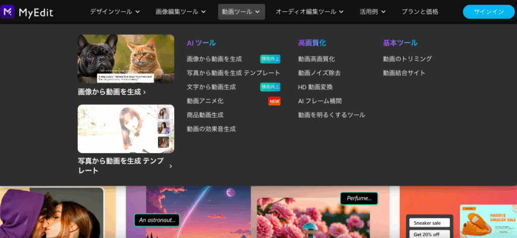 MyEdit(提供:CyberLink)は、画像・イラストの生成ができるツールで、スタイル選択や構図指定が可能です。日本語で使える点も初心者には嬉しいポイントです。