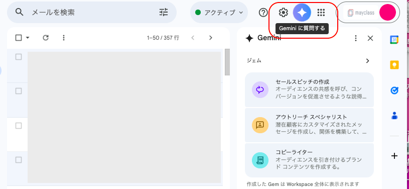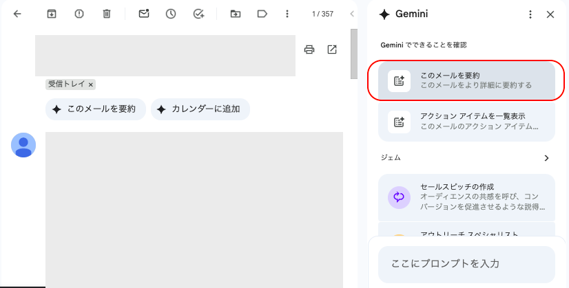 受信メールを開くと、右側のGeminiパネルに「内容の要約」や「返信文の提案」が自動表示され、AIに質問しながらそのまま返信文を整えることが可能です。
