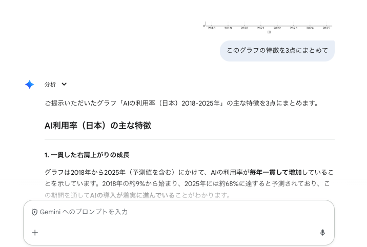 グラフ画像を読み込んで「このデータを解説して」と指示すれば、要点やトレンドを言語化してくれます。