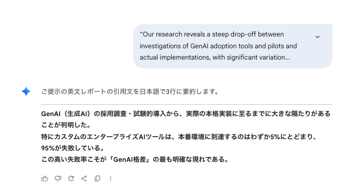 これまで人が行っていた情報収集や整理、文書作成といった工程を、Geminiが統合的にサポートすることで、「考えることに集中できる時間」を確保し、仕事そのものの質を高めることができます。