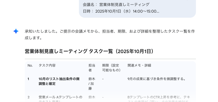 また、Geminiが提案するToDoリストや次回のアクションプランをもとに、チーム全体が同じ方向を向いた意思決定を行うことが可能です。