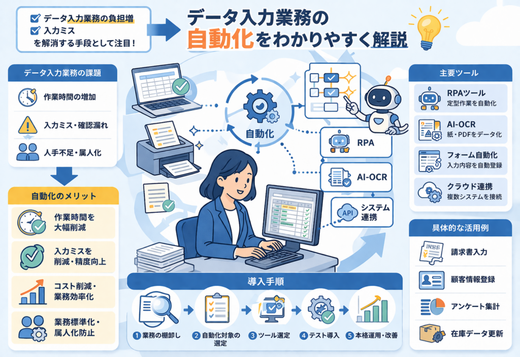 データ入力業務の負担増やミスを解消する手段として注目される「自動化」について、仕組みや主要ツール(RPA・AI-OCRなど)、導入手順、メリットを体系的に解説。業務効率化やDX推進の観点から、失敗しない導入ポイントや具体的な活用例までわかりやすくまとめた実践的な内容です。
