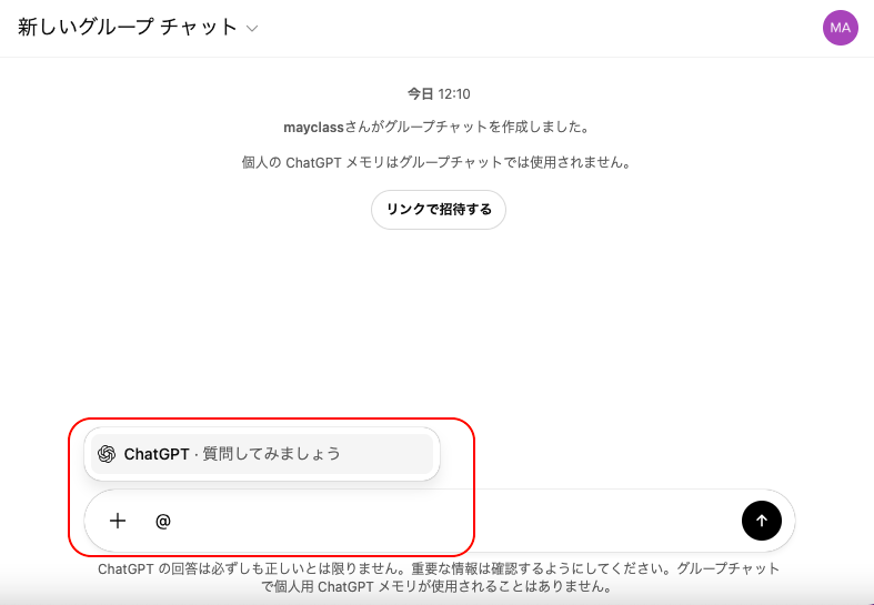 1つのチャットルームには最大20人までのユーザーとChatGPTを同時に招待でき、全員が同じ会話に参加できます。