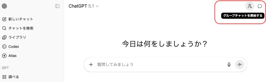 ChatGPTアプリまたはWeb版にアクセスすると、左側のメニューに「+ 新しいチャット」や「グループチャットを作成」のような項目があります。