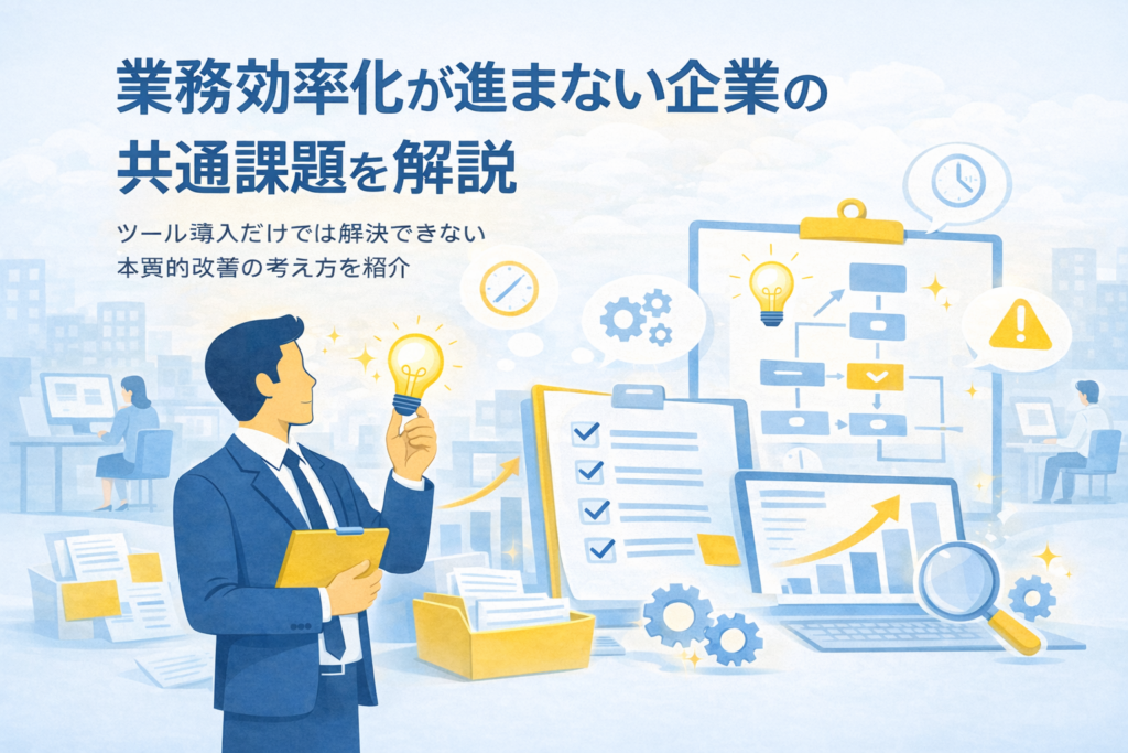 人手不足や業務量の増加を背景に、多くの企業で業務効率化は重要な課題となっています。しかし、ツール導入だけでは成果につながらないケースも少なくありません。本記事では、効率化が進まない企業に共通する課題や見落とされがちなポイントを整理し、業務の可視化や仕組み化といった本質的な改善の考え方をわかりやすく解説します。