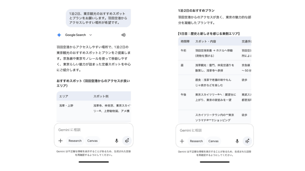 - 曖昧なプロンプト:「東京旅行のプランを教えて」