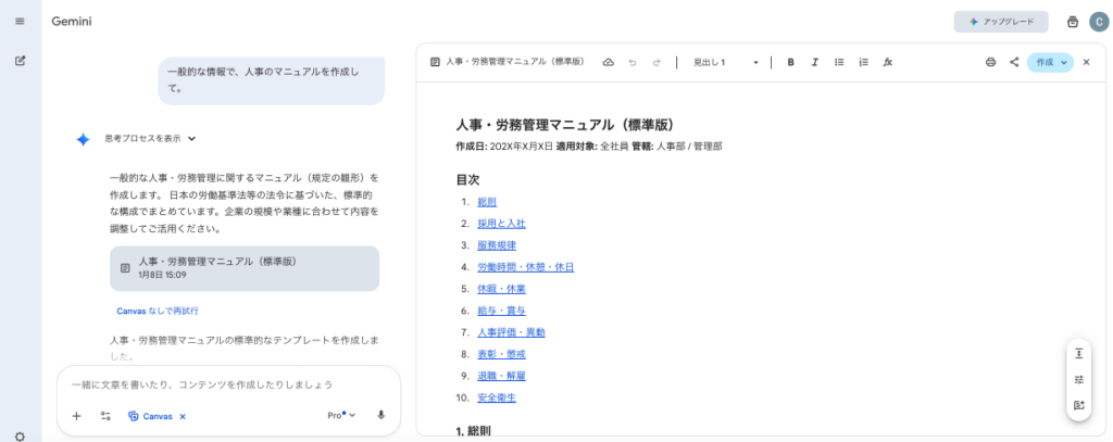 Gemini Canvasが最も力を発揮するのが、資料やマニュアルといった「形に残す文書」の作成です。