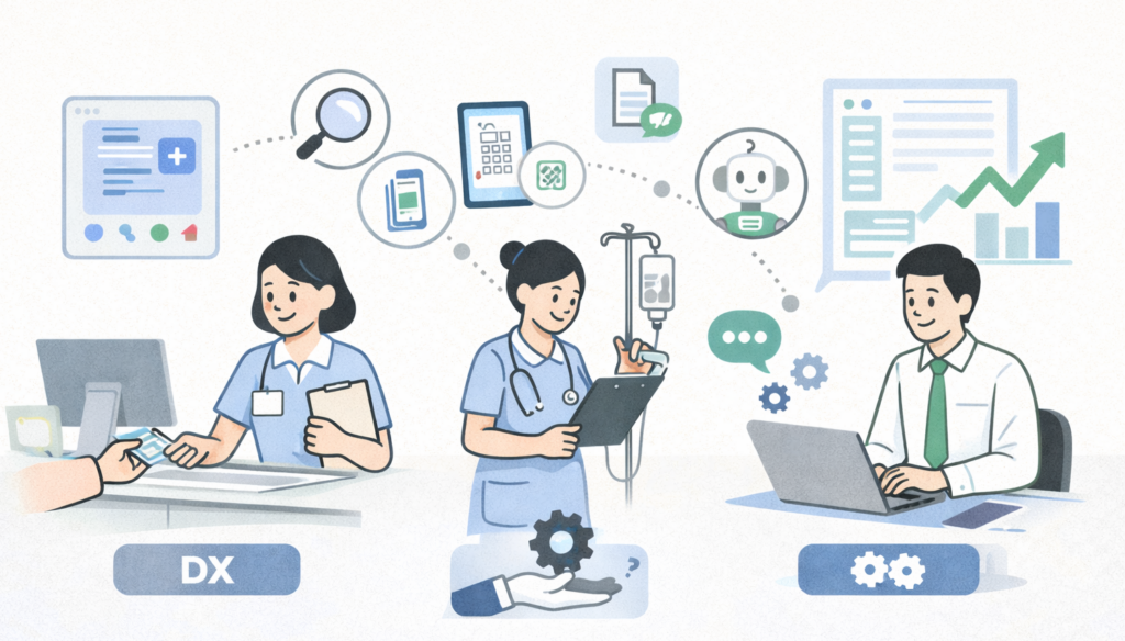 DXは、病院業務効率化を進めるうえで効果的です。ただし、ツールを導入すること自体が目的になると現場に定着しにくくなります。業務の流れを整理したうえでDXを取り入れ、現場に合った形で効率化を進めましょう。