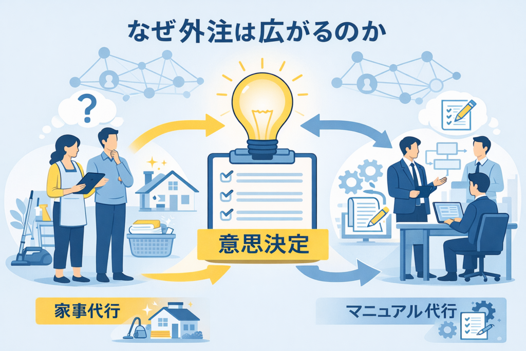 本記事では、「家事代行の普及」と「マニュアル作成代行」の構造的な共通点から、これからの企業にとっての“任せる意思決定”を考えていきます。