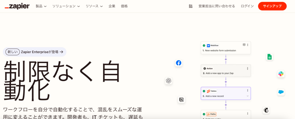 さらに、プログラミングが苦手な人でも使えるノーコード自動化ツール「Zapier」なら、「フォーム入力→スプレッドシート自動記録」「新しいメール→Slack通知」などをワンクリックで設定できます。