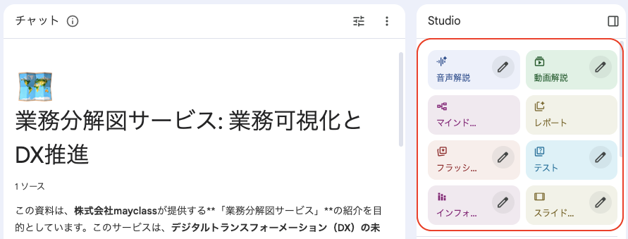 音声解説だけでなく、資料内容をもとに動画解説を生成したり、スライド形式に変換したりすることもできるため、社内共有や説明資料の作成など、アウトプット用途にも展開しやすくなります。