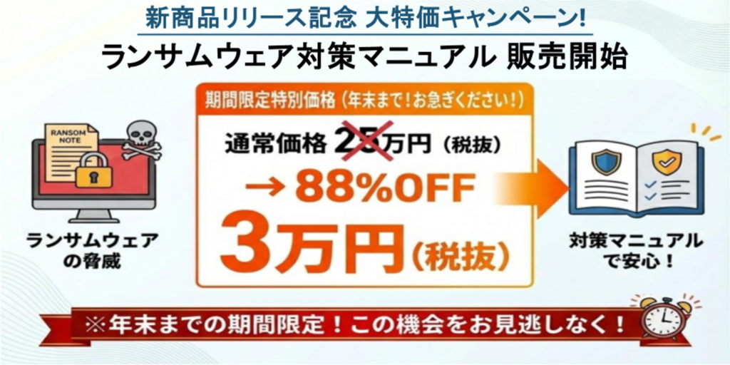 この『ランサムウェア対策マニュアル』は、不安を抱えたまま日々を過ごすのではなく、その小さな不安を取り除き、万が一の際に「迷わず動ける」体制を整えるための「予防」と「初動対応」に特化した実践ガイドです。