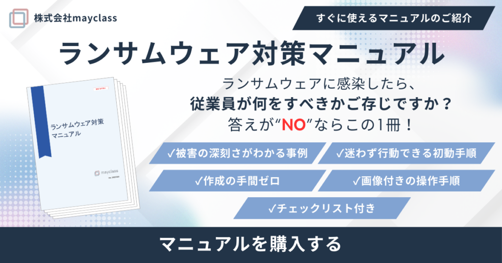第1弾はランサムウェア対策マニュアルからスタートしましたが、mayclassでは今後、経理、総務、人事、営業など、あらゆる業務の標準的な内容をマニュアルとして順次商品化していく予定です。